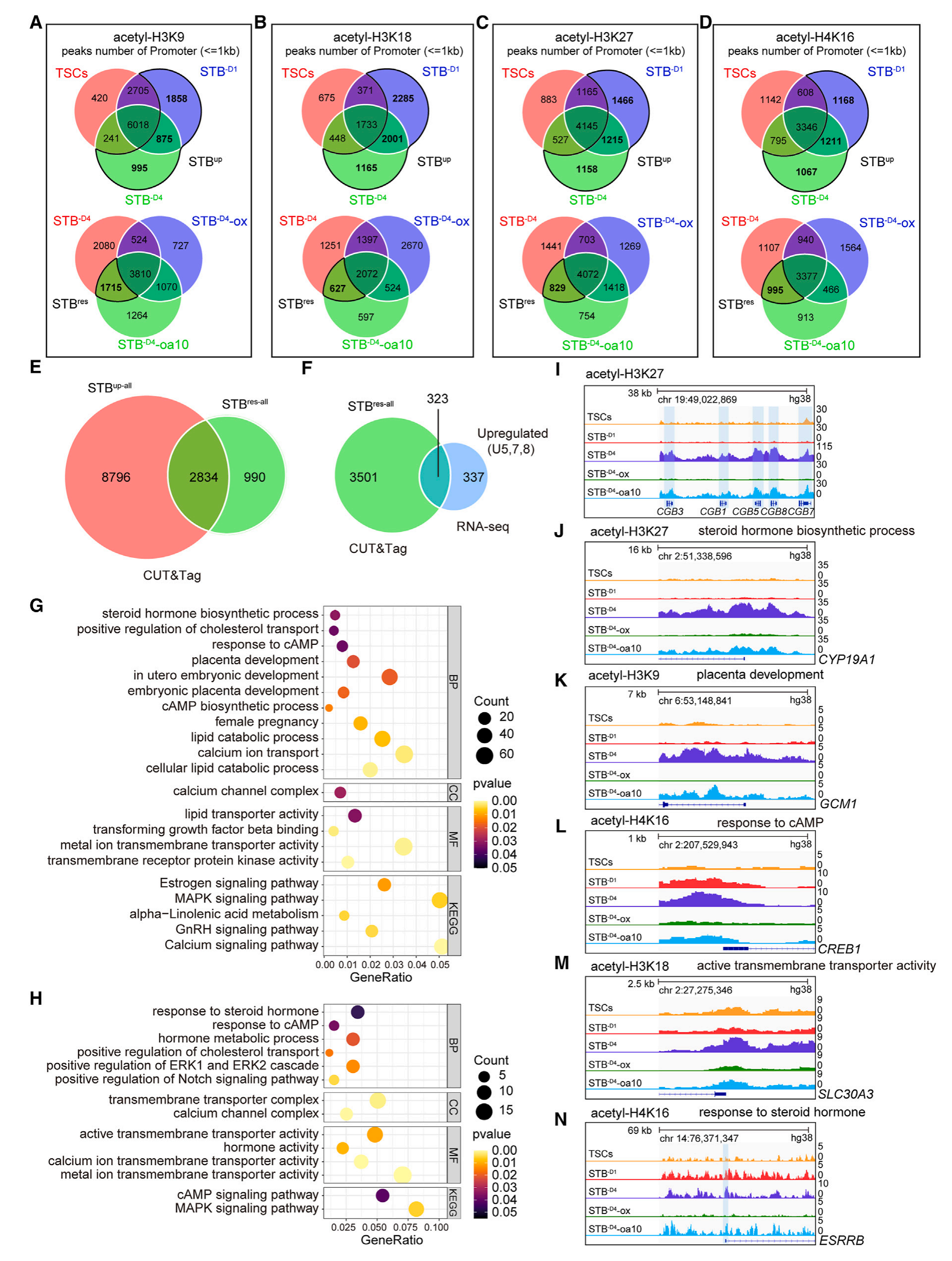 為了探究被乙酸拯救的組蛋白乙酰化是否也導致轉錄拯救,該研究比較了來自CUT&Tag的STBres-all集與來自RNA-seq的拯救基因集(包括U5、U7和U8,共660個基因)。分析結果顯示,這兩個基因集共有323個基因(圖6F),即表觀遺傳和轉錄獲救。對這些表觀遺傳和轉錄獲救的基因進行GO和KEGG通路分析的結果與RNA-seq分析的結果相似,在cAMP和MAPK信號、激素合成/分泌以及其他合胞途徑中的跨膜物質運輸中都有顯著的富集(圖6H、6M、6N)。