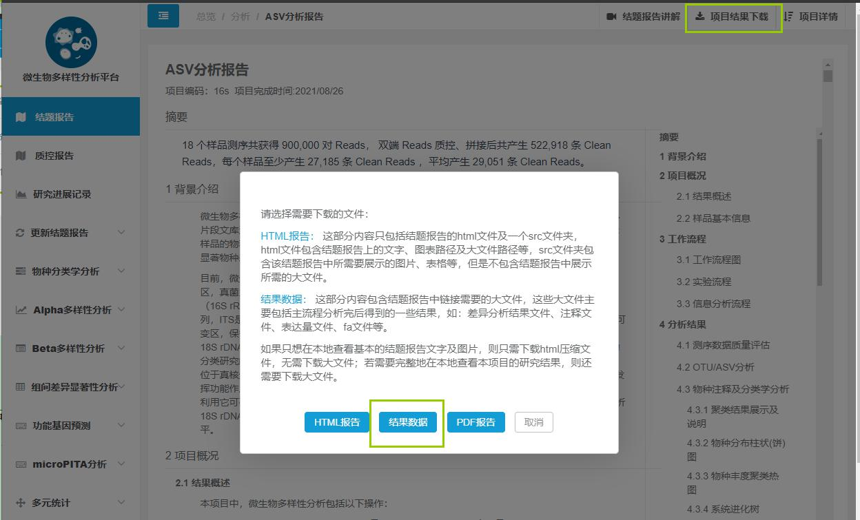 6 新報告結(jié)果下載:打開新的報告,點擊這份報告的右上角-項目結(jié)果下載-進行下載結(jié)果數(shù)據(jù),就可以得到更新的這份報告的全部結(jié)果。