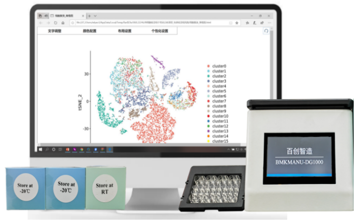 為了突破單細(xì)胞試劑耗材及儀器長(zhǎng)期以來(lái)的國(guó)外技術(shù)壟斷,降低單細(xì)胞應(yīng)用的成本,讓單細(xì)胞技術(shù)能夠惠及更多的科研群體,經(jīng)過(guò)多年潛心研發(fā),百創(chuàng)智造發(fā)布自主研發(fā)的極速單細(xì)胞微液滴系統(tǒng)-百創(chuàng)DG1000。百創(chuàng)DG1000是基于微流控、油滴包裹和Barcode標(biāo)記等技術(shù)來(lái)實(shí)現(xiàn)高通量的細(xì)胞捕獲。除了儀器以外,百創(chuàng)DG1000還有配套的2×4的獨(dú)立芯片及配套試劑盒(圖4)。