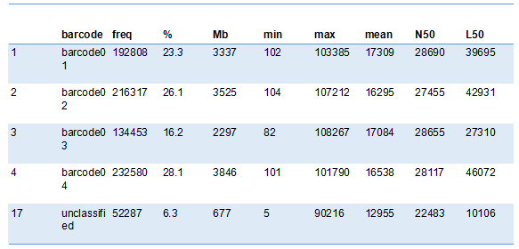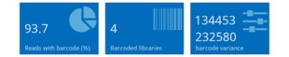 在加入barcode序列混樣測(cè)序的情況下,barcode識(shí)別區(qū)分的結(jié)果展示如下,包括barcode識(shí)別效率,區(qū)分的文庫(kù)個(gè)數(shù)及每個(gè)文庫(kù)中序列個(gè)數(shù)占比和長(zhǎng)度信息等。