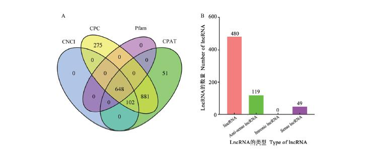 利用CPC、CPAT、CNCI和Pfam4種方法依次鑒定出1906、1682、750和648條lncRNA,四者的交集為648個(gè)(圖3-A);其中基因間區(qū)lncRNA(longintergenicRNA,lincRNA)、反義鏈lncRNA(anti-senselncRNA)和正義鏈lncRNA(senselncRNA)的數(shù)量分別為480、119和49個(gè)(圖3-B)。