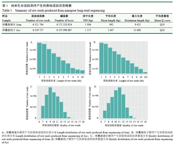 球囊菌菌絲和孢子的納米孔測(cè)序分別得到6321704和6259727條原始讀段,N50分別達(dá)到1094和1157bp,平均長(zhǎng)度分別為992和1047bp,長(zhǎng)的長(zhǎng)度分別為9421和13060bp(表1)。來(lái)源于Aam和Aas的原始讀段的長(zhǎng)度分布介于1-10kb以上,其中分布reads數(shù)多的長(zhǎng)度均為1kb(圖1-A、1-B);原始讀段的Q值分布介于Q6-Q15,分布reads數(shù)多的質(zhì)量值分別為Q9和Q11(圖1-C、1-D)。