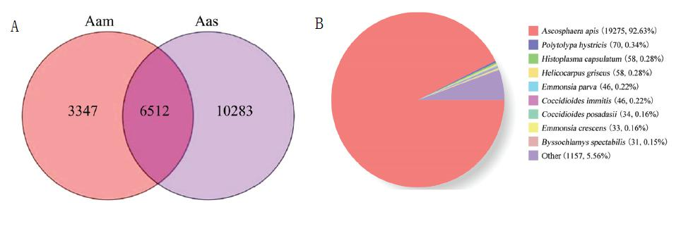 圖2球囊菌菌絲和孢子全長(zhǎng)轉(zhuǎn)錄本的Venn分析(A)、全長(zhǎng)轉(zhuǎn)錄本的Nr數(shù)據(jù)庫(kù)注釋(B)Fig.2Vennanalysisoffull-lengthtranscriptsinA.apismyceliumandspore(A)、Nrdatabaseannotationoffull-lengthtranscripts(B)