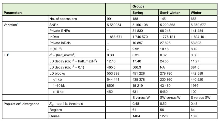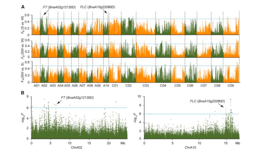 該研究對(duì)991份油菜天然種質(zhì)資源進(jìn)行了遺傳多樣性的測(cè)序和鑒定。通過(guò)對(duì)兩個(gè)不同的參考基因組,即“Darmor-bzh”和“Tapidor”基因組的定位讀數(shù)產(chǎn)生的兩組SNPs的群體遺傳學(xué)分析,得出了一致的結(jié)論。遺傳多樣性和連鎖不平衡參數(shù)表明甘藍(lán)型油菜兩個(gè)亞基因組的進(jìn)化是不對(duì)稱的。選擇性掃描分析揭示了與調(diào)控植物發(fā)育和應(yīng)激反應(yīng)的各個(gè)方面相關(guān)的基因的遺傳變化。并對(duì)影響開(kāi)花時(shí)間的SNPs進(jìn)行了探索。