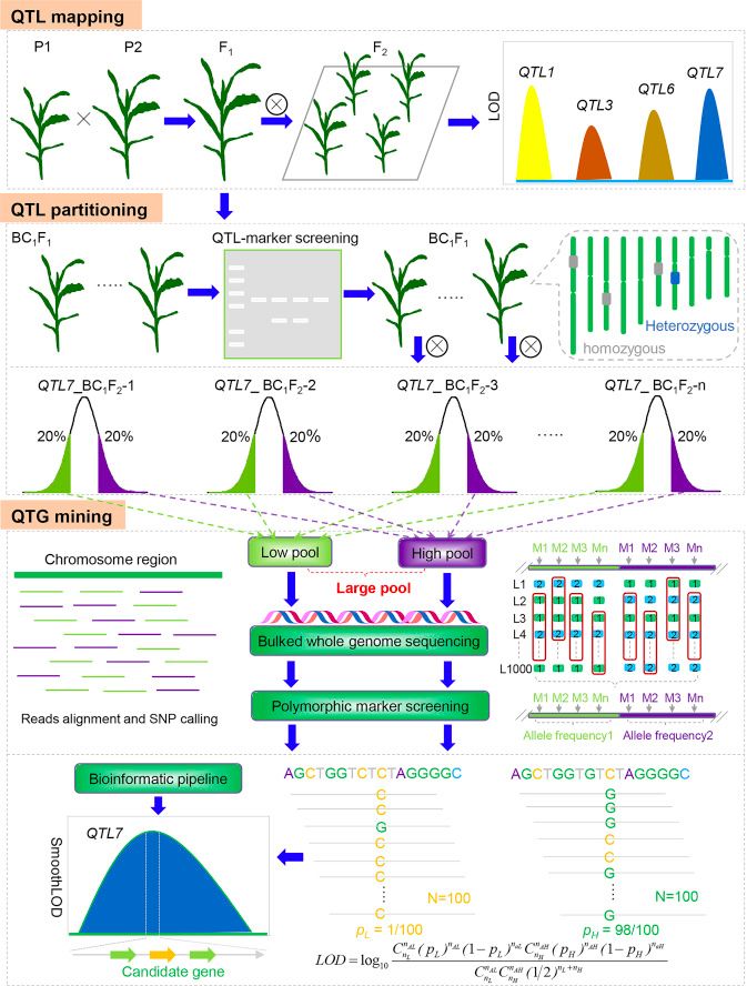 介于上述種種定位方法的局限性,本文介紹一種新的方法——QTG-Seq,即通過QTL分離(即,將數(shù)量性狀轉(zhuǎn)化為質(zhì)量性狀),極端表型混池,高通量測序以及新算法挖掘候選基因。這一方法是由華中農(nóng)業(yè)大學(xué)李林課題組、章元明課題組與中國農(nóng)科院王國英課題組開發(fā)并應(yīng)用成功,最后以“QTG-seq accelerates QTL fine mapping through QTL partitioning and whole-genome sequencing on bulked segregant samples”為題,在線發(fā)表在Molecular Plant上。