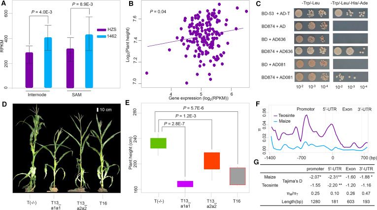 為進(jìn)一步確定候選基因,本研究又通過RNA-seq分析發(fā)現(xiàn),Zm00001d020874表達(dá)量在雙親的莖頂端分生組織(SAM)與幼嫩節(jié)間組織中存在顯著性差異?;跀M南芥同源蛋白功能與smoothLOD定位信號,認(rèn)為Zm00001d020874是qPH7的候選基因,并且后續(xù)的CRISPR基因敲除,蛋白互作驗(yàn)證等實(shí)驗(yàn)均暗示Zm00001d020874是控制株高的基因。