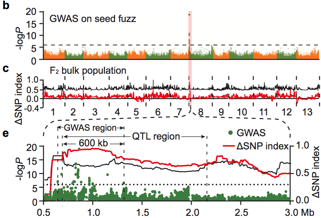對來自不同環(huán)境下的11個重要性狀進(jìn)行全基因組關(guān)聯(lián)分析,鑒定了亞洲棉11個重要農(nóng)藝性狀的98個顯著關(guān)聯(lián)位點,GaKASIII的非同義替換(半胱氨酸/精氨酸替換)使得棉籽中的脂肪酸組成(C16:0和C16:1)發(fā)生了變化;發(fā)現(xiàn)棉花枯萎病抗性與GaGSTF9基因的表達(dá)激活相關(guān)。選擇了亞洲棉種質(zhì)中的158份有絨毛和57份無絨毛材料進(jìn)行GWAS關(guān)聯(lián)分析,發(fā)現(xiàn)與毛狀體和纖維發(fā)育有關(guān)信息(圖3)。