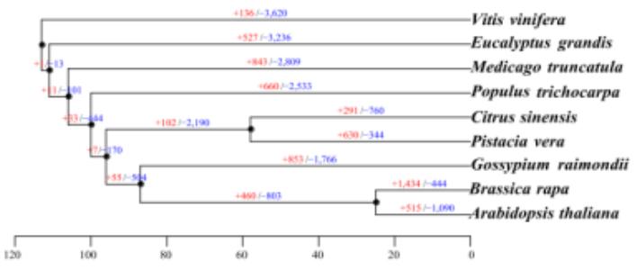 開心果系統(tǒng)進(jìn)化樹與基因家族收縮擴(kuò)張分析