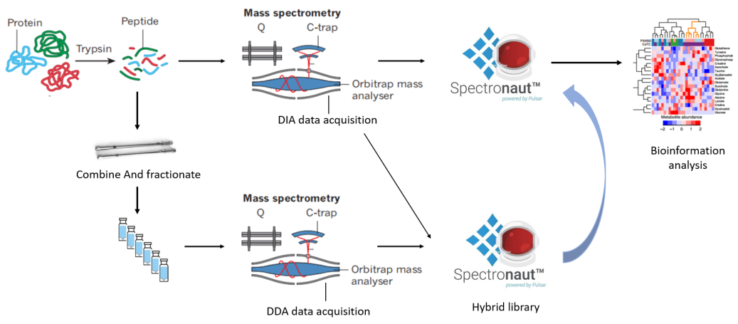 數(shù)據(jù)非依賴性的掃描模式(Date-independent acquisition,DIA)是近幾年發(fā)展的一種新的質(zhì)譜數(shù)據(jù)采集方式。可以將質(zhì)譜全掃描分為若干窗口,然后對每個(gè)窗口中的所有離子進(jìn)行檢測、碎裂,從而無遺漏、無差異地獲得樣本中所有離子的信息。目前流行的蛋白質(zhì)組學(xué)研究手段,如ITRAQ、TMT、Label free、SILAC采用的都是數(shù)據(jù)依賴掃描模式(Date-dependent acquisition,DDA)。相對于DDA,DIA方法具有重復(fù)性好、蛋白覆蓋率高、定量z確度高等特點(diǎn),適用于大樣本。