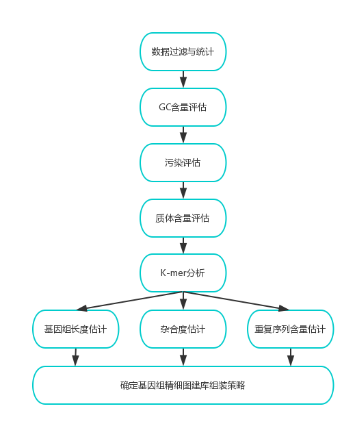 雙端測(cè)序數(shù)據(jù)通過評(píng)估雙端測(cè)序數(shù)據(jù)通過評(píng)估(GC分布統(tǒng)計(jì)、質(zhì)量值Q20、Q30評(píng)估)、過濾后得到高質(zhì)量的數(shù)據(jù)(clean reads),用于基因組大小的評(píng)估、基因組的組裝、GC含量的統(tǒng)計(jì)、雜合率的統(tǒng)計(jì)(以及組裝后的評(píng)估)。具體信息分析流程見圖2。