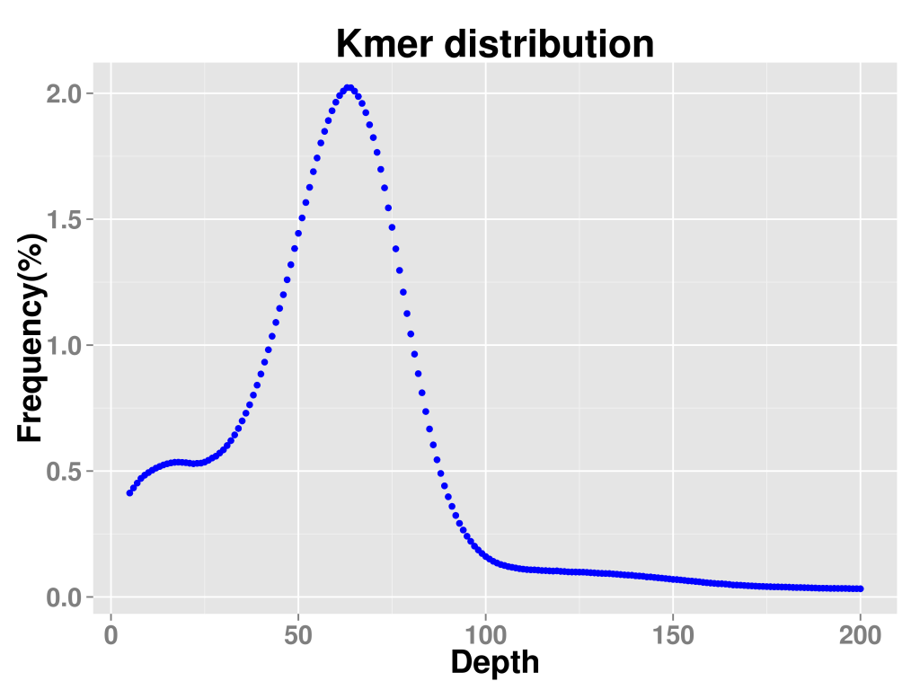 由于基因組存在雜合位點(diǎn)和重復(fù)序列,k-mer曲線往往不會(huì)呈現(xiàn)出良好的泊松分布,而是在主峰前后出現(xiàn)其他的峰,如果存在一定雜合度,會(huì)導(dǎo)致在主峰對(duì)應(yīng)的橫坐標(biāo)的二分之一處出現(xiàn)雜合峰,而一定的重復(fù)度則會(huì)在主峰對(duì)應(yīng)的橫坐標(biāo)的整數(shù)倍處出現(xiàn)重復(fù)峰。