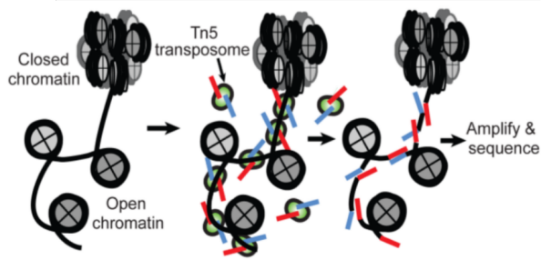 ATAC-seq(Assay for Transposase-Accessible Chromatin with highthroughput sequencing),基于高通量測序的染色質(zhì)轉(zhuǎn)座酶可接近性實驗。在核小體連接致密的地方,轉(zhuǎn)座酶不能進入,而松散的區(qū)域,轉(zhuǎn)座酶能夠進入并切割下暴露的DNA區(qū)域,并同時連接上特異性的接頭,有接頭的DNA片段被分離出來,用于高通量測序。因此,ATAC-seq可以得是全基因度尺度上處于開放狀態(tài)的染色質(zhì)區(qū)域,并且通過分析染色質(zhì)開放區(qū)域的motif,可以獲得潛在的活躍轉(zhuǎn)錄因子及其靶基因。