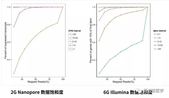 針對同一樣本進(jìn)行的飽和度分析顯示,2G ONT全長除表達(dá)量極低的(CPM<1)其他轉(zhuǎn)錄本都達(dá)到飽和了,和二代Illumina 6G除表達(dá)量極低FPKM<1外的基因檢測也飽和了,且前者更早趨向飽和;