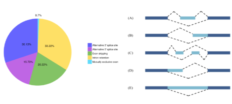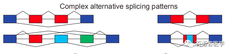 基因轉(zhuǎn)錄生成的前體mRNA(pre-mRNA),有多種剪接方式,選擇不同的外顯子,產(chǎn)生不同的成熟mRNA,從而翻譯為不同的蛋白質(zhì),構(gòu)成生物性狀的多樣性。這種轉(zhuǎn)錄后的mRNA加工過程稱為可變剪接或選擇性剪接(Alternative splicing)。可變剪接類型包括:(A) 外顯子跳躍;(B) 可變轉(zhuǎn)錄終止位點(diǎn);(C) 可變外顯子;(D)可變轉(zhuǎn)錄起始位點(diǎn);(E) 內(nèi)含子保留。