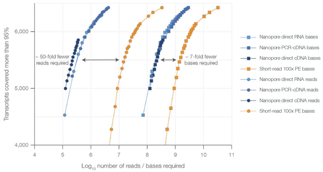 ONT全長轉(zhuǎn)錄組測序一條reads即代表該轉(zhuǎn)錄本表達(dá)一次,而二代短reads需要非常多條才能覆蓋一個轉(zhuǎn)錄本;oxford nanopore公司官方白皮書中數(shù)據(jù)顯示:當(dāng)相同數(shù)量的轉(zhuǎn)錄本被覆蓋達(dá)95%時(shí),ONT所需要的reads數(shù)比Illumina約少50倍,所需要堿基數(shù)約少7倍。