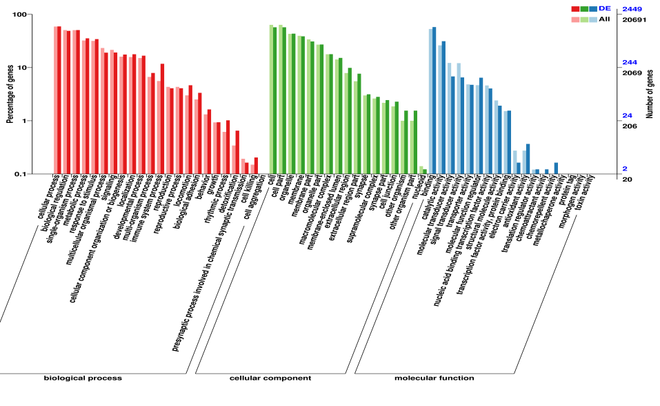 GO注釋分類統(tǒng)計(jì)圖,直觀的反映出在生物過程(biological process)、細(xì)胞組分(cellular component)和分子功能(molecular function),可深入挖掘差異基因和轉(zhuǎn)錄本的功能及所在的信號通路,篩選關(guān)注差異基因和轉(zhuǎn)錄本注釋情況。